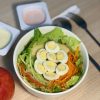Xà lách tươi giòn kết hợp cùng bắp cải tím và cà rốt bào sợi tạo màu cực hút mắt. Cà chua bi mọng nước và trứng luộc cắt lát giúp món ăn cân bằng, còn ức gà thì mềm – bùi, ăn nhẹ mà vẫn đủ chất. Một chút hành phi thơm thơm làm điểm nhấn, trộn cùng sốt Teriyaki là hòa vị ngay lập tức.